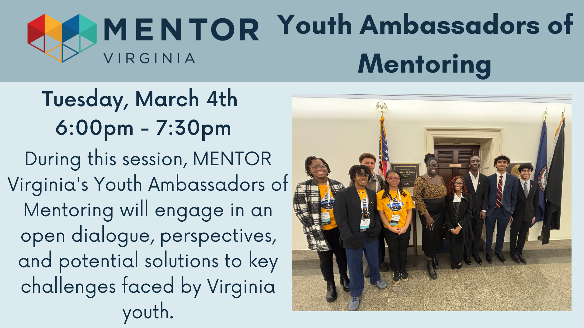 Register HERE Are you considering becoming a mentor or getting ready to be a mentor? Take the first step and attend one of MENTOR Virginia’s virtual New Mentor Trainings. Let our trainers prepare you to be the most effective mentor possible. By attending our virtual training, you will learn what to expect from a mentor-mentee […]
